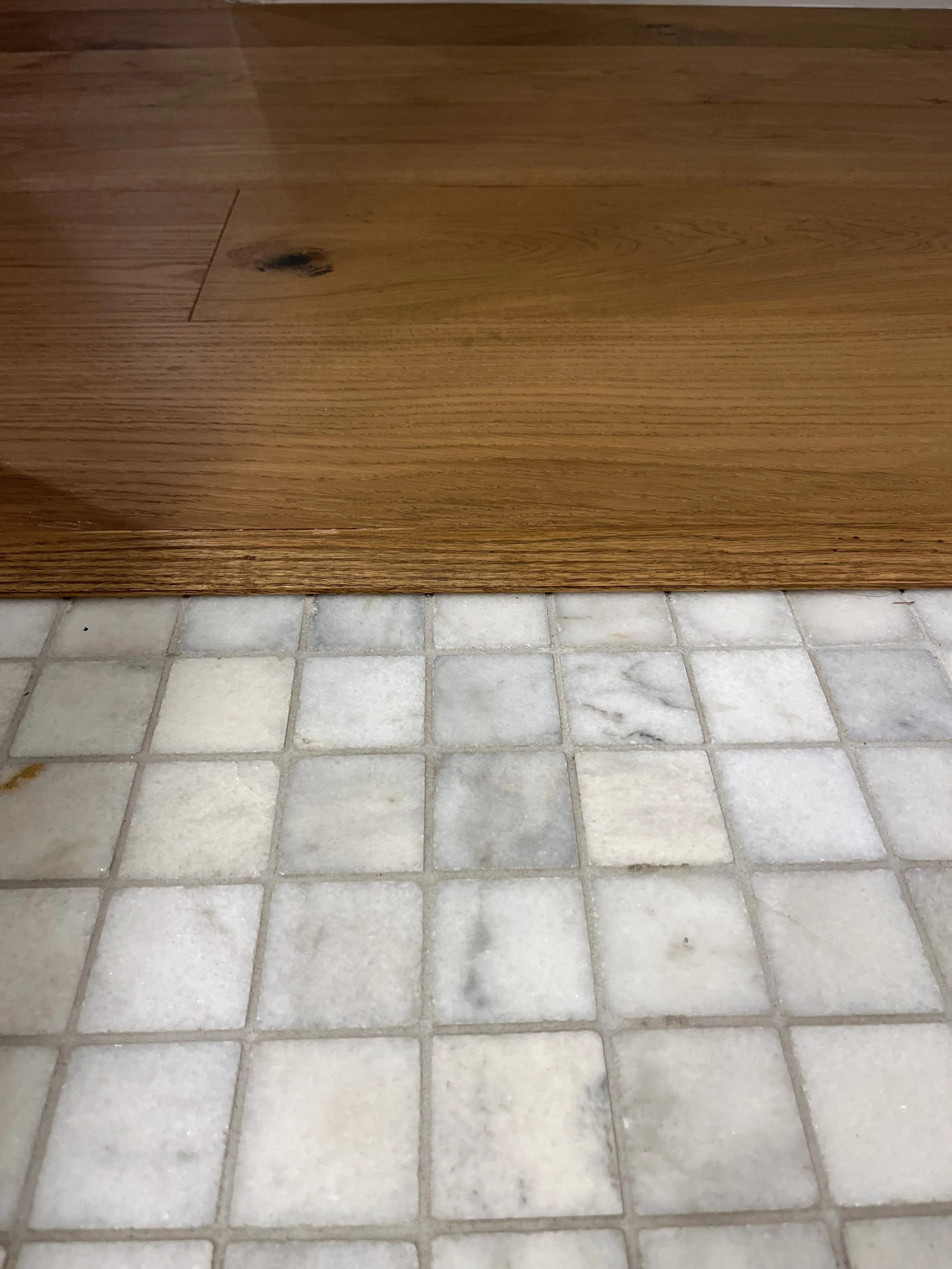 This small bathroom tile floor is flush with the hallway threshold , great UD. No tripping hazard here!