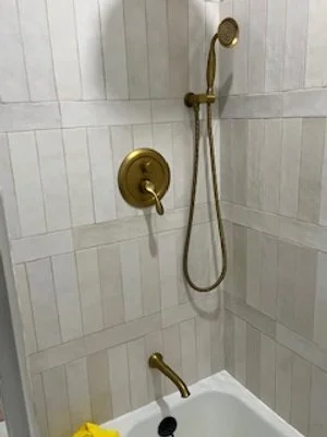 This shower/tub combo has a hand held shower head with the adapter/mixer close by. There is an overhead rain shower as well. Modifications need to work for you and be simple, easy to use, equitable to all, intuitive, and look nice. All UD features.